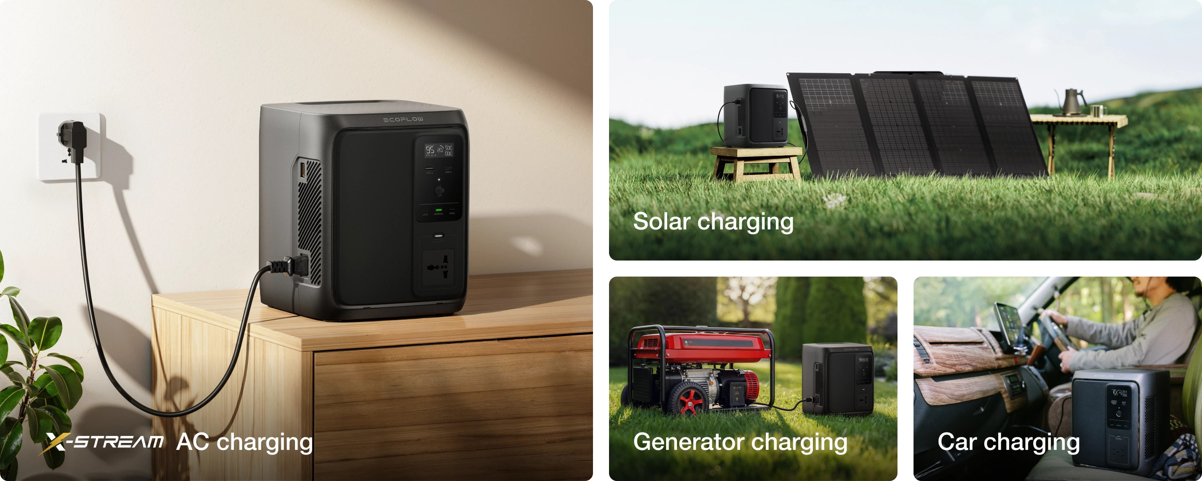 With EcoFlow’s X-Stream fast AC charging, DELTA 3 Air fully recharges in just 2 hours—ready before the next outage. For flexibility, you can also top up with up to 1000W of solar, or recharge via generator or car when off-grid.