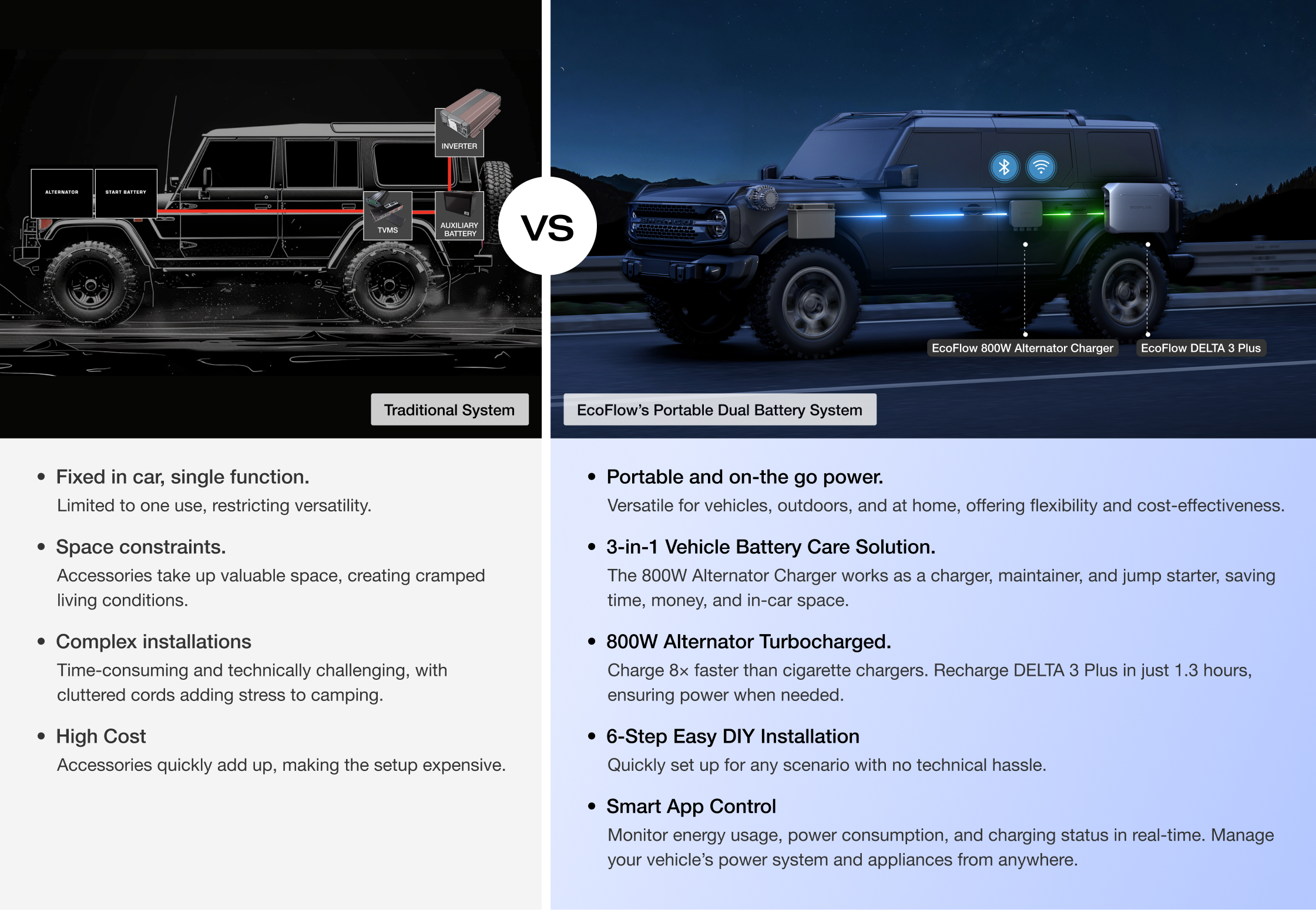 Unlike traditional 12V systems, EcoFlow’s Portable Dual Battery System offers easy DIY installation with no fixed wiring. Pair it with EcoFlow’s DELTA Series power stations and the 800W Alternator Charger for record-fast charging. Enjoy clean energy with no fumes, no noise, and no maintenance, while powering 99% of everyday appliances.