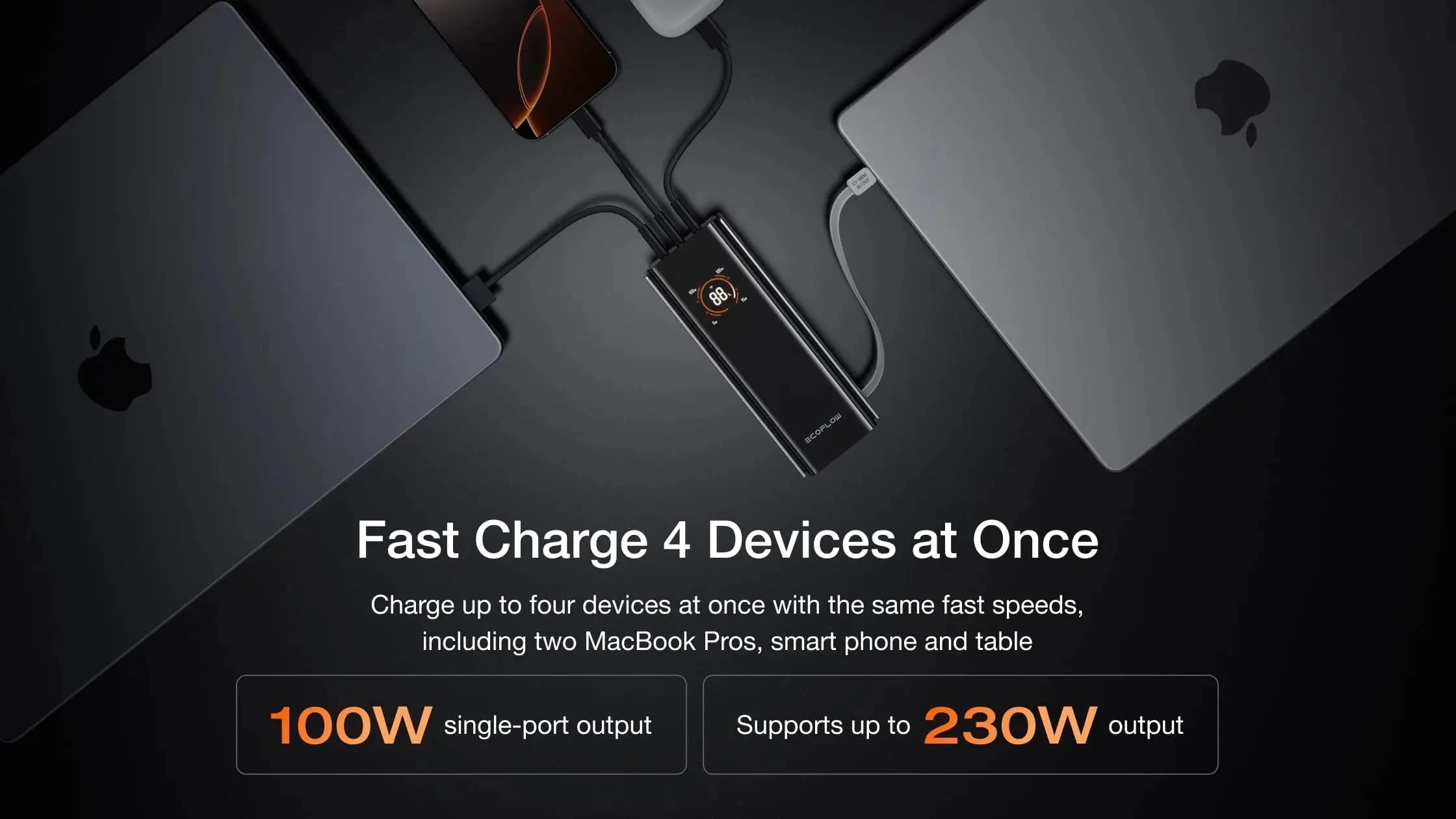 Supports pass-through charging, with the power level depending on the power requirements of the devices connected to each port.Input supports PD3.0, PPS, QC3.0, AFC, BC1.2;Output supports PD3.0 PPS, QC3.0, AFC, Apple2.4A, BC1.2, SCP, FCP, UFCS