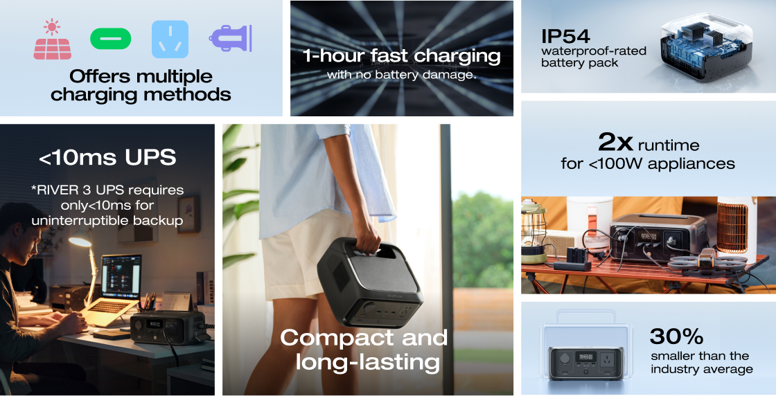With groundbreaking X-GaNPower, RIVER 3(UPS) is changing the industry with compact, quiet batteries that deliver long runtimes for small electronics. By tapping into the superior energy efficiency of GaN, this series stretches the operating time of low-wattage devices while reducing the size and controlling the volume.