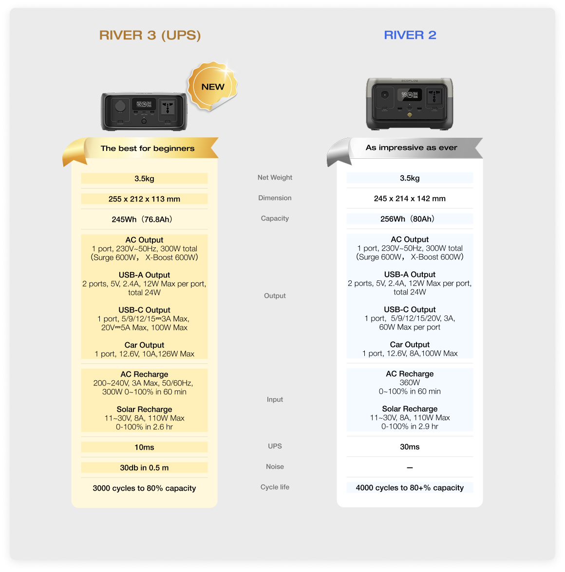 The RIVER 3 (UPS) offers a lifespan of 3000 charging cycles—equivalent to approximately 10 years of daily use before its capacity drops to 80%.