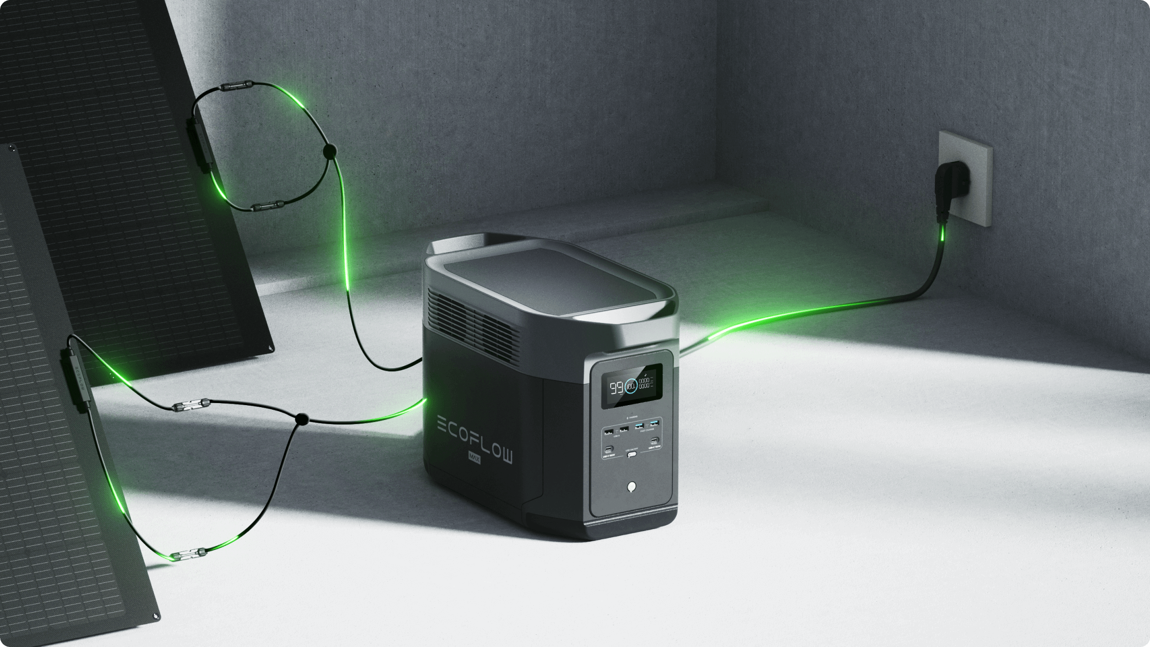 With a solar input of 1000W, fully recharged in 2.3 hours by connect up to 2 EcoFlow 400W Portable Solar Panels or 4 sets of 220W Bifacial Solar Panels.