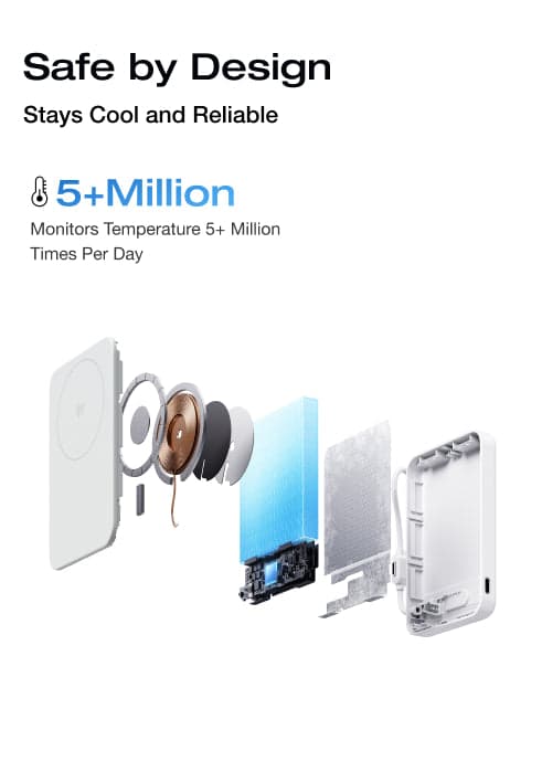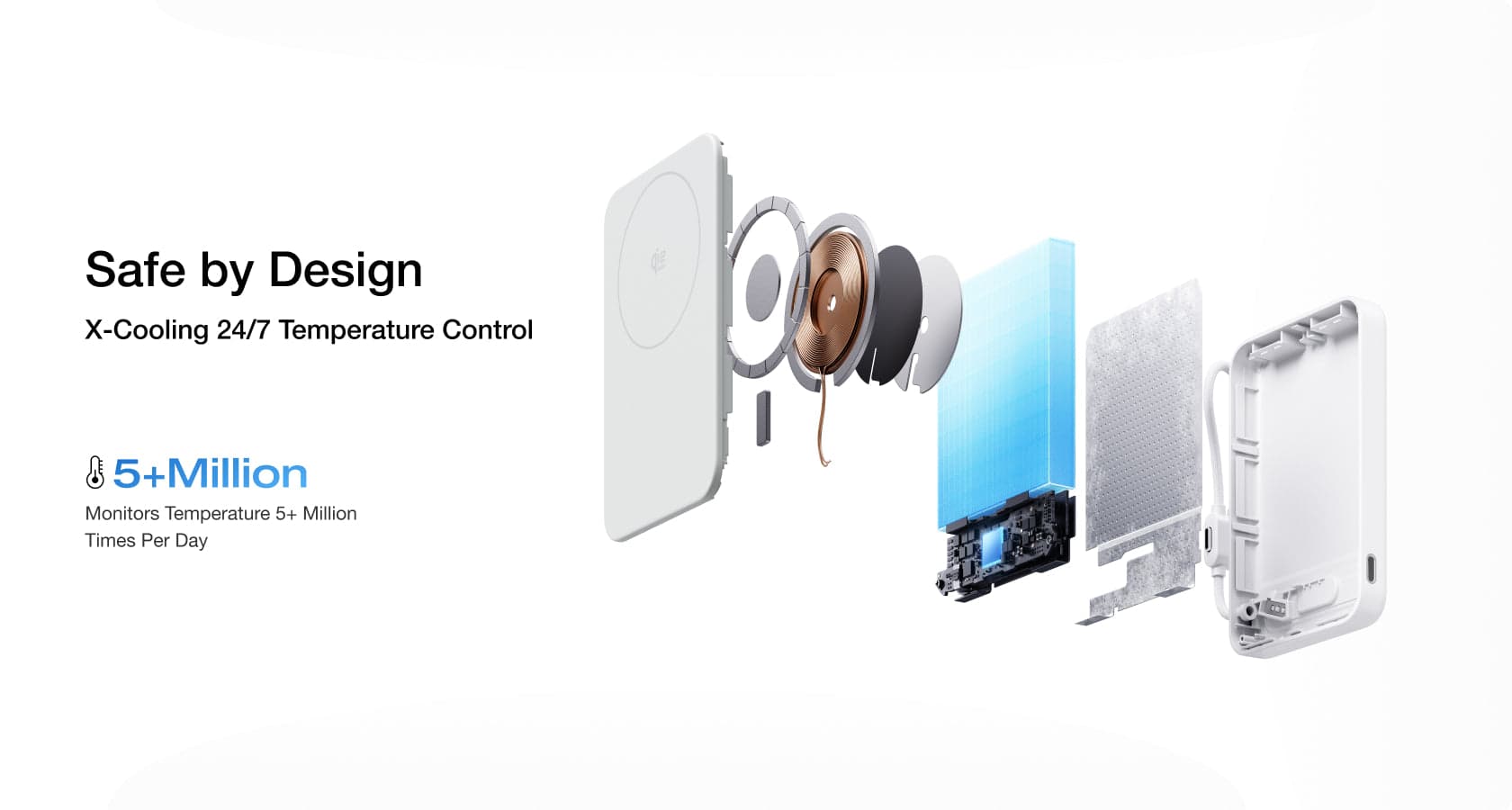 Enjoy peace of mind knowing that your power bank has passed rigorous safety test. Its exclusive cooling structure and real-time temperature monitoring keep the case below 107.6℉/42°C, reducing heat and slowing battery aging.