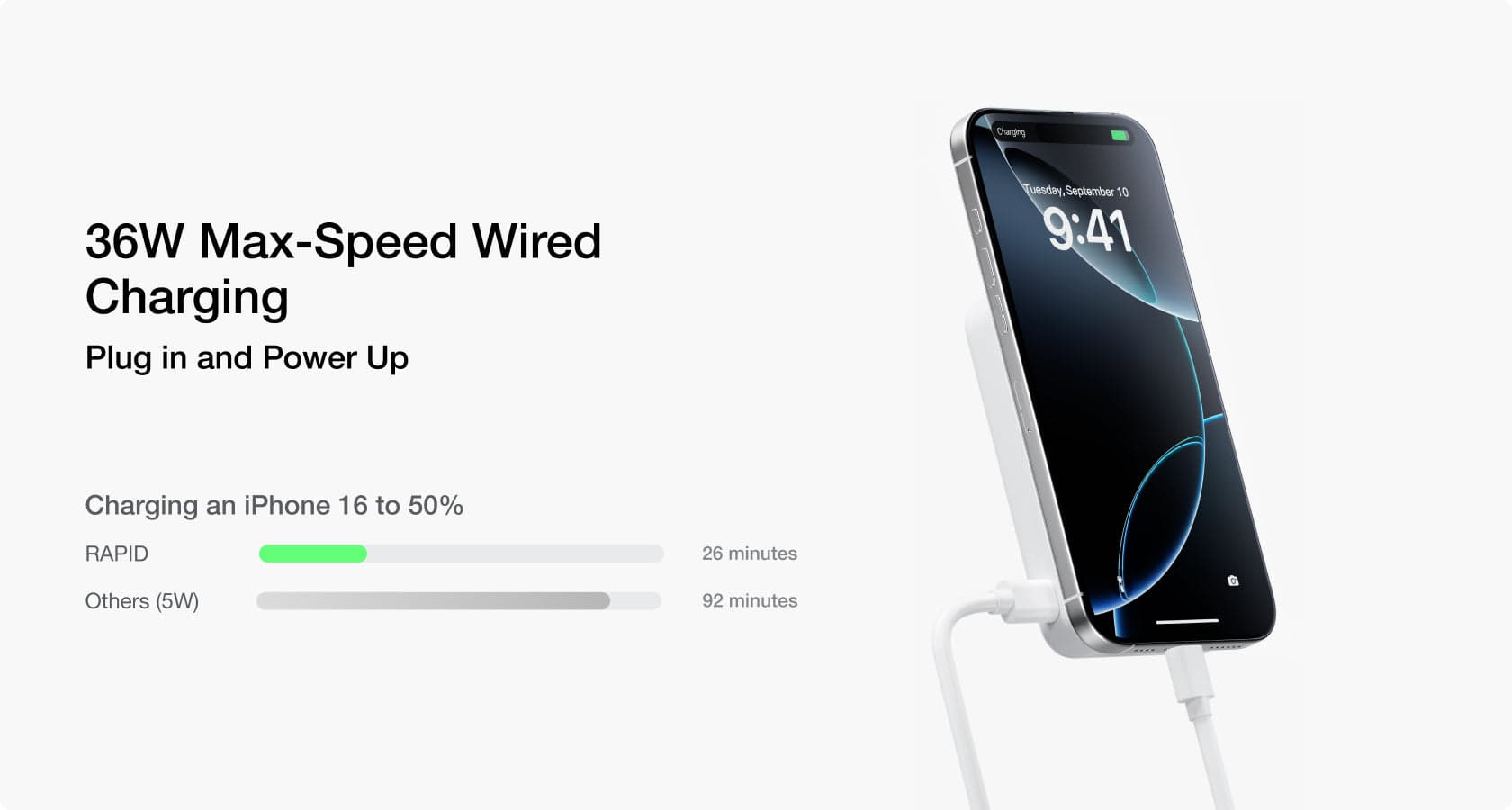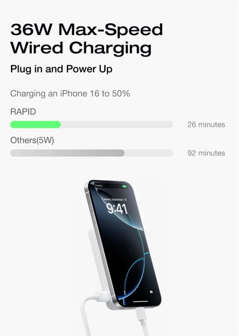 Plug in your USB-C cable to unlock 36W fast charging—perfect for powering up your iPhone at top speed whenever you need it.
