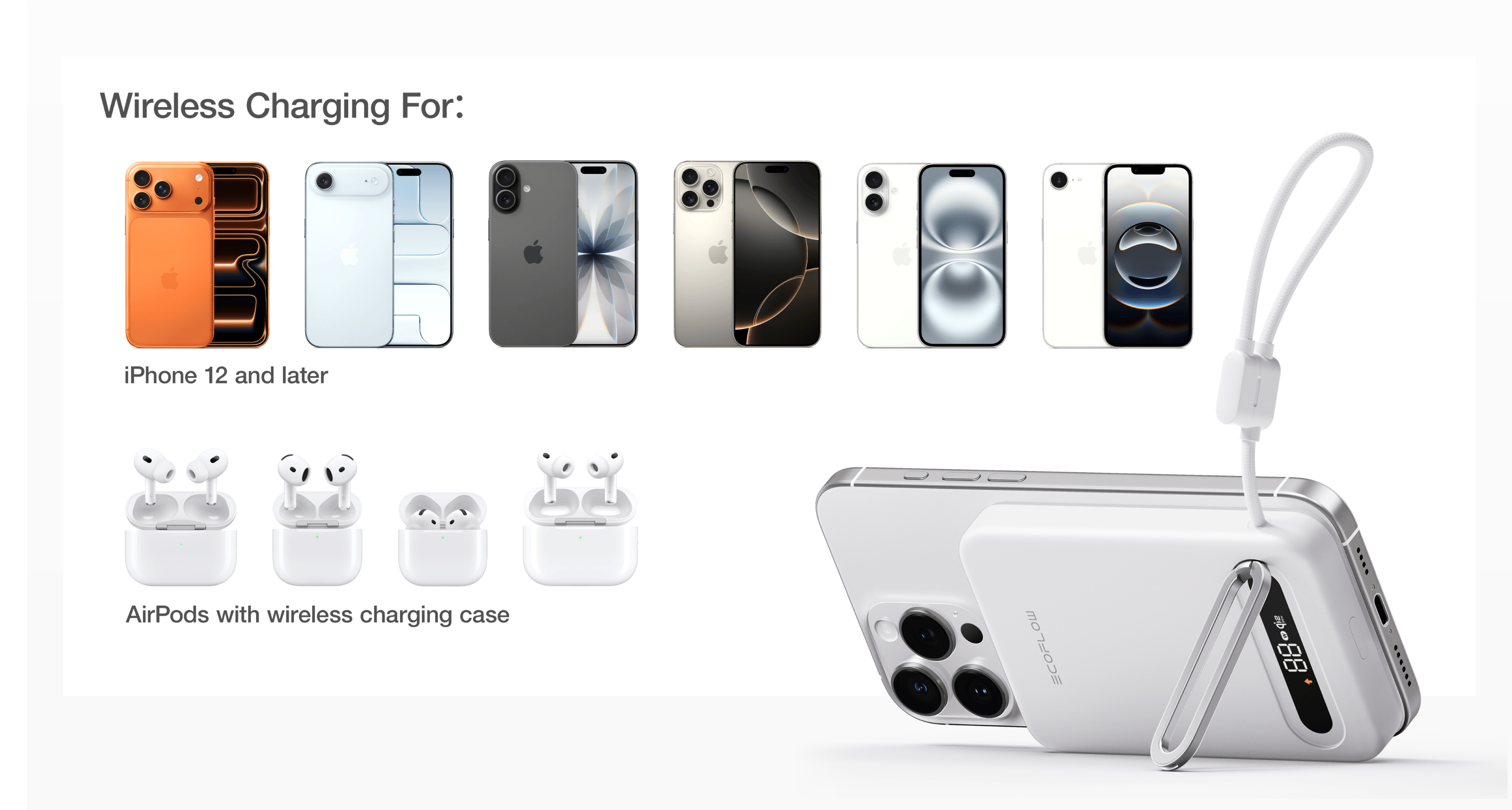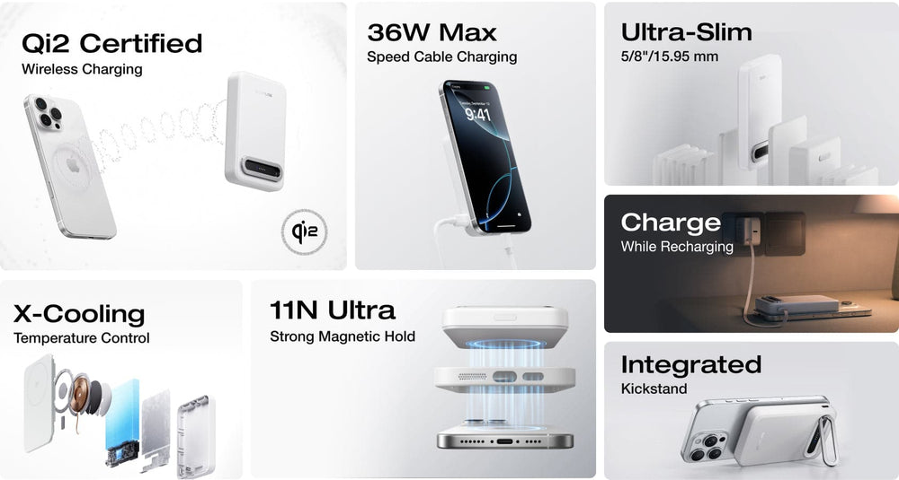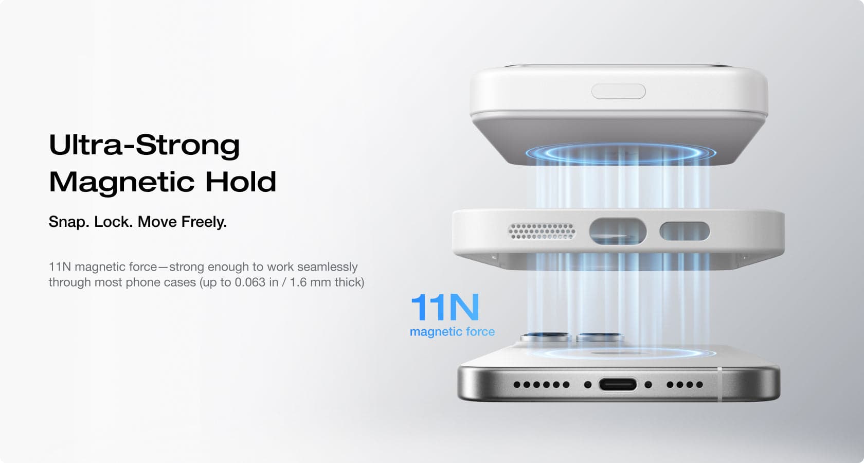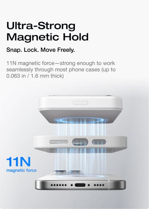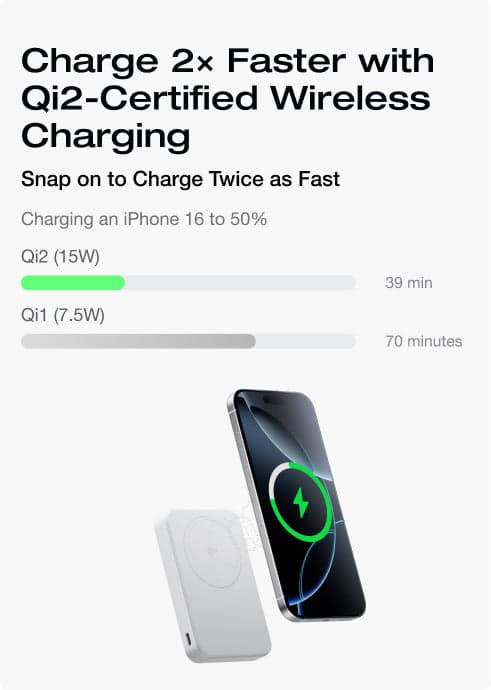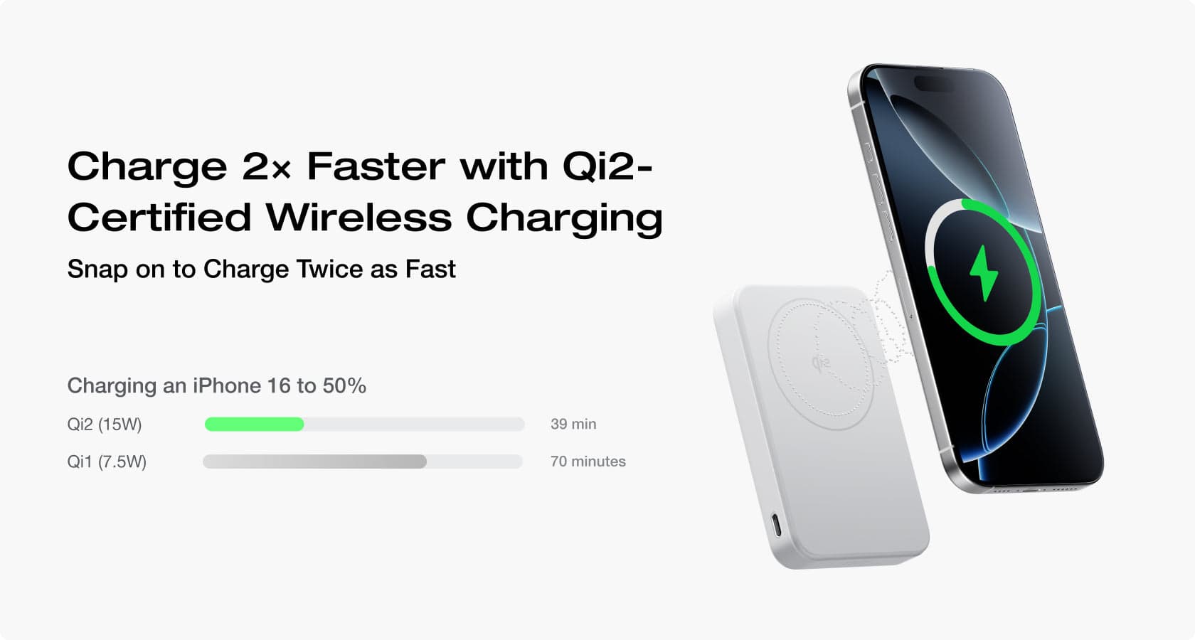 Enjoy 15W ultra-fast Qi2-certified wireless charging and power up your devices 2× faster than Qi1.