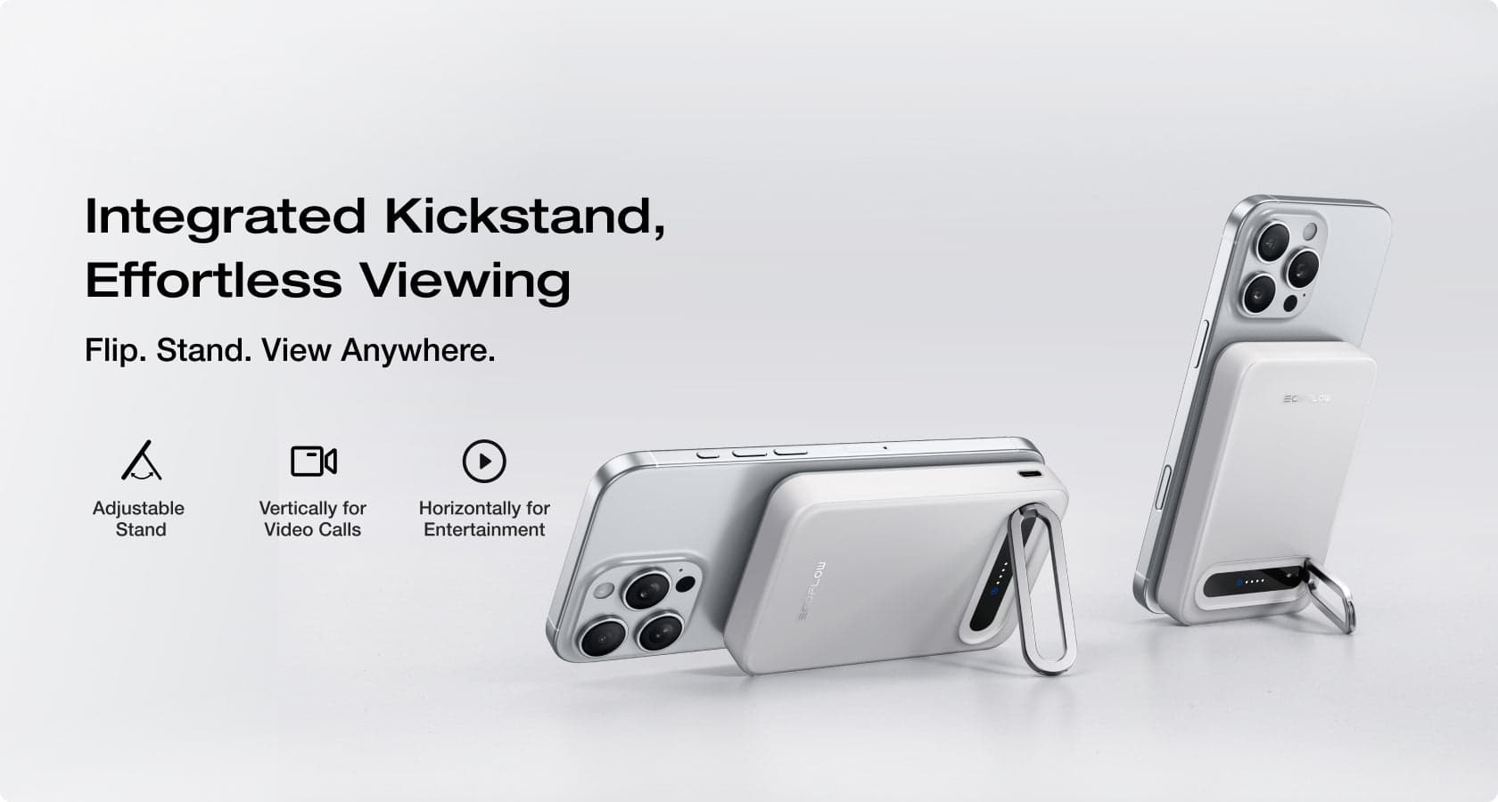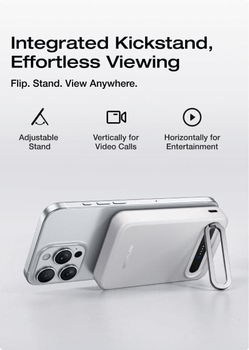 The crystal clear screen shows battery level, output, and remaining charge time. Flip out the sturdy built-in kickstand to go hands-free—vertically for video calls, horizontally for movies, meetings, or scrolling with stability.