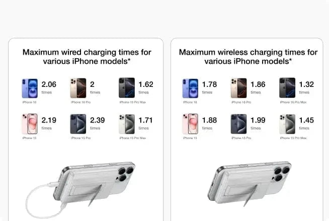 Supports simultaneous charging and discharging. Wireless charging up to 7.5W Max. When discharging simultaneously, wireless charging is disabled by default, but can be enabled by pressing and holding the button for 3 seconds.