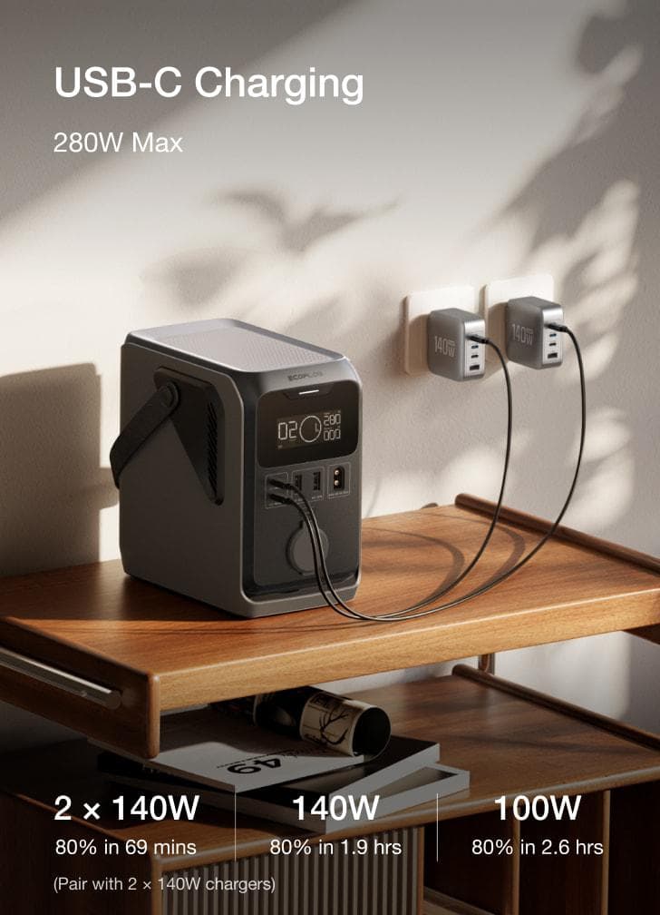 Trail 200 provides 2 USB-C ports with a maximum input of 140W and a maximum input of 100W. Trail 300 provides dual USB-C ports with a maximum input of 140W and a solar/car charger port with a maximum input of 110W.
