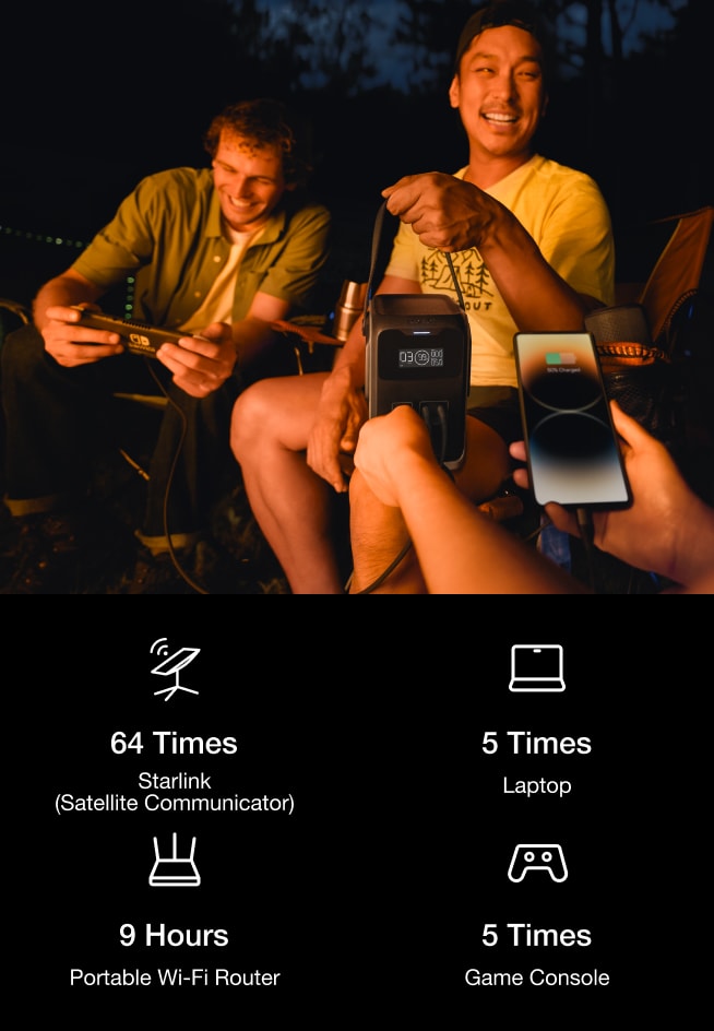 With 192Wh (60,000mAh) capacity—equivalent to 6 power banks in one—TRAIL 200 DC effortlessly powers all your friends’ devices.