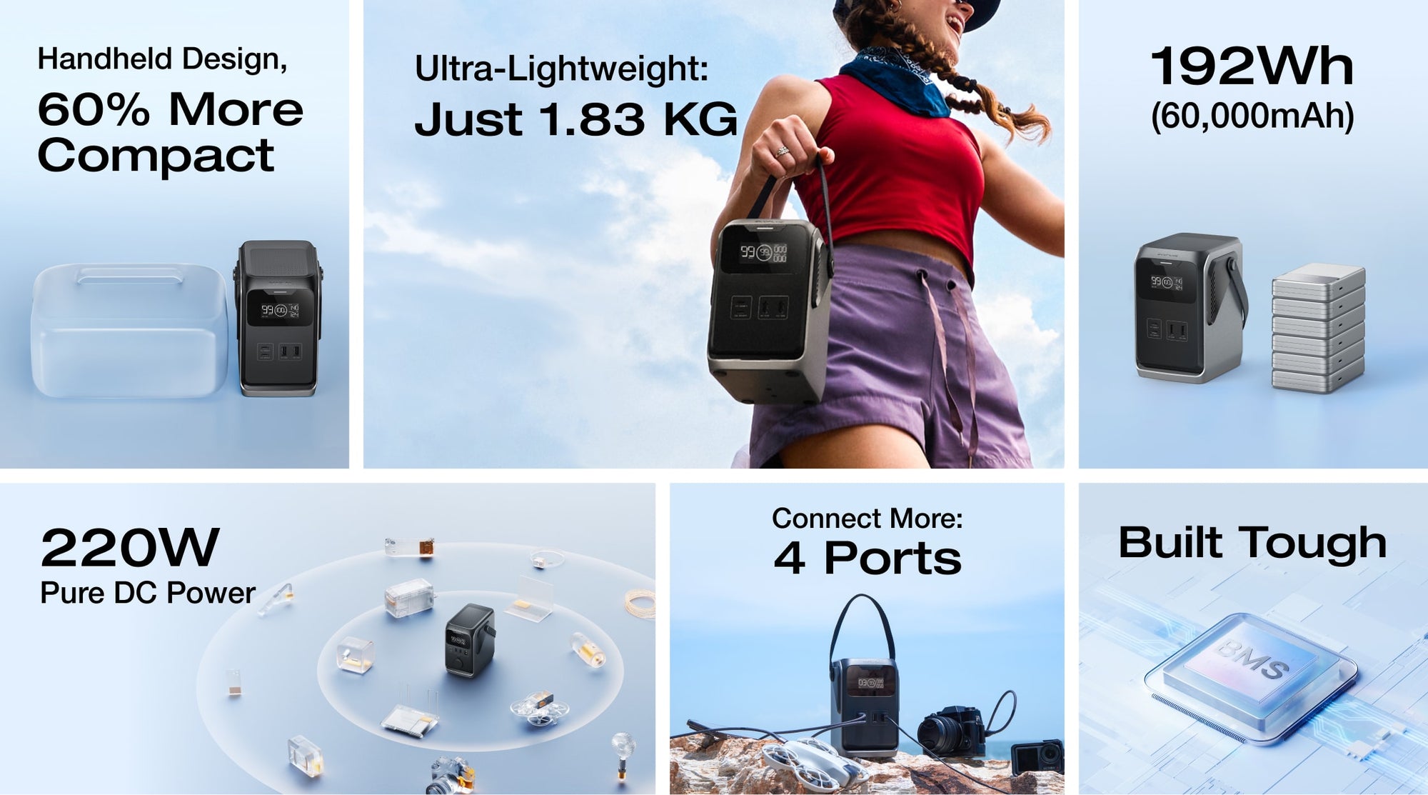 Pure DC power delivers 220W total output (140W max one single port) - enough for 90% of essential outdoor gear. Perfect for all your light camping power needs.